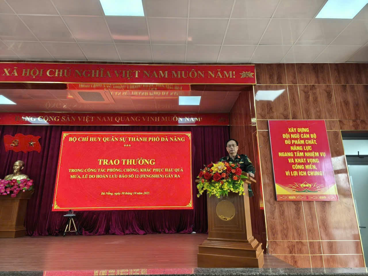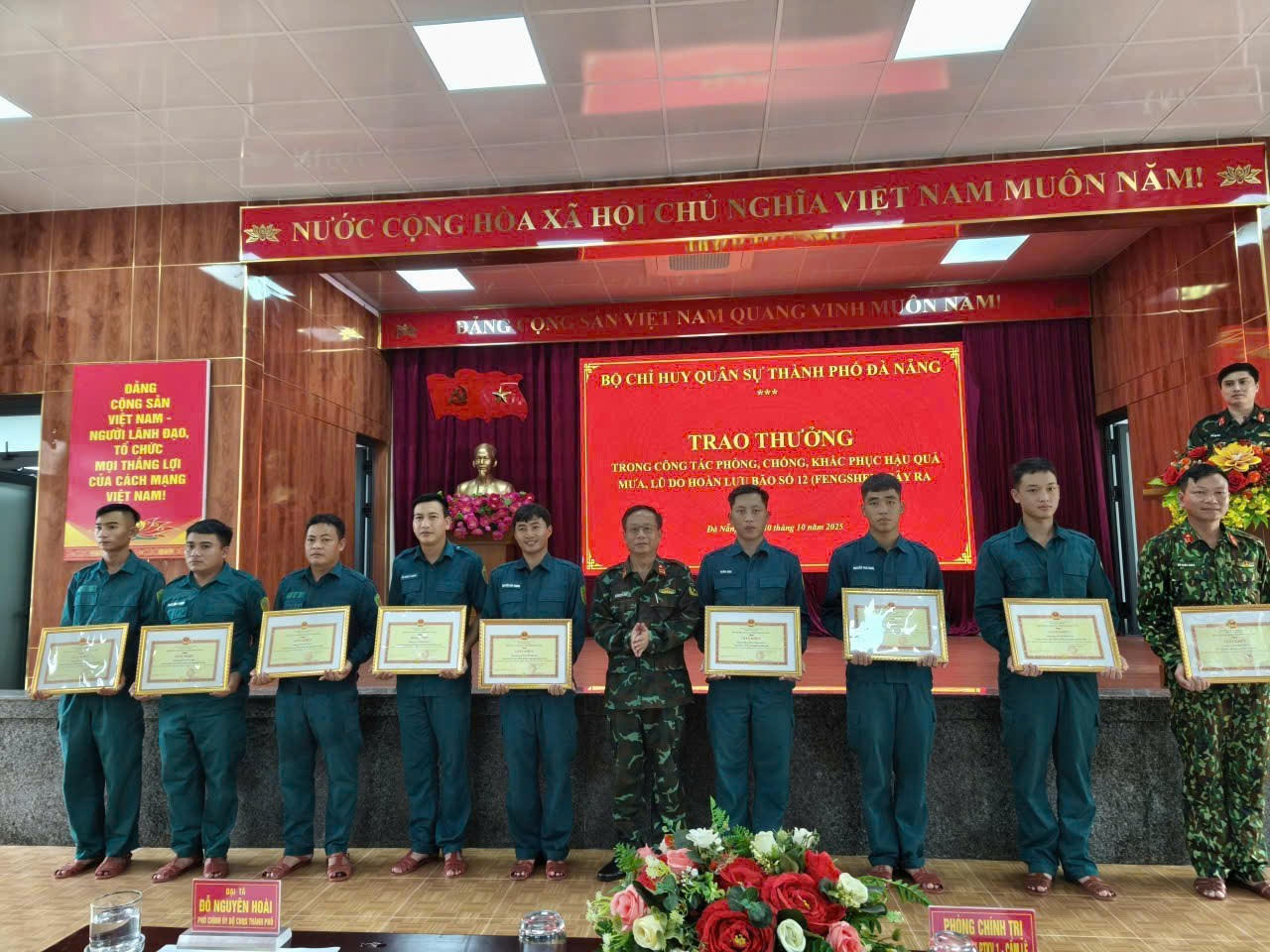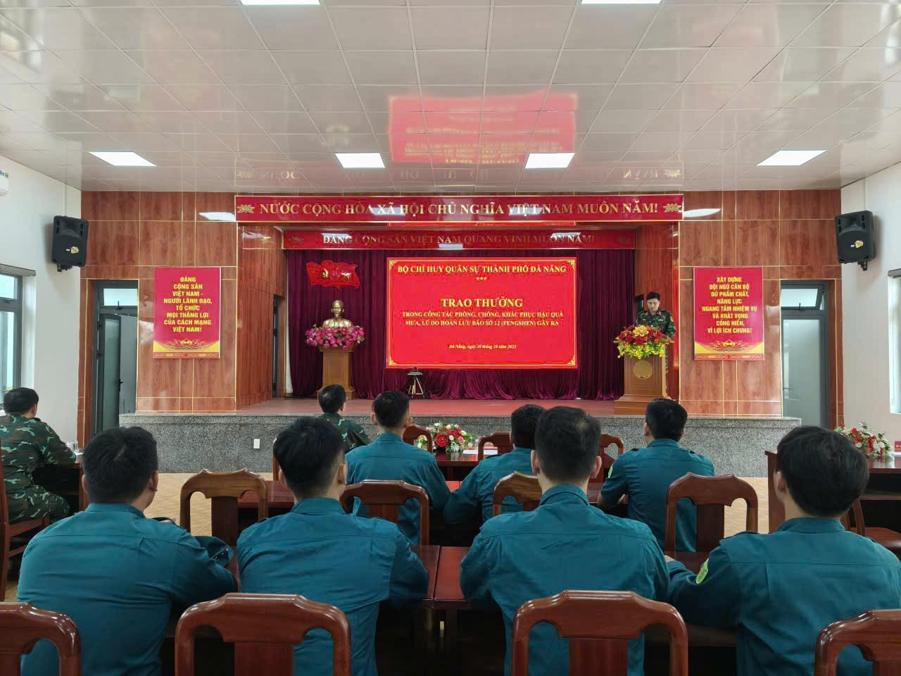 Đại tá Đỗ Nguyên Hoài, Ủy viên Ban Thường vụ Đảng ủy Quân sự, Phó Chính ủy Bộ CHQS Thành phố Đà Nẵng trao thưởng cho những cá nhân và tập thể có thành tích xuất sắc trong phòng, chống và khắc phục hậu quả cơn bão 12.