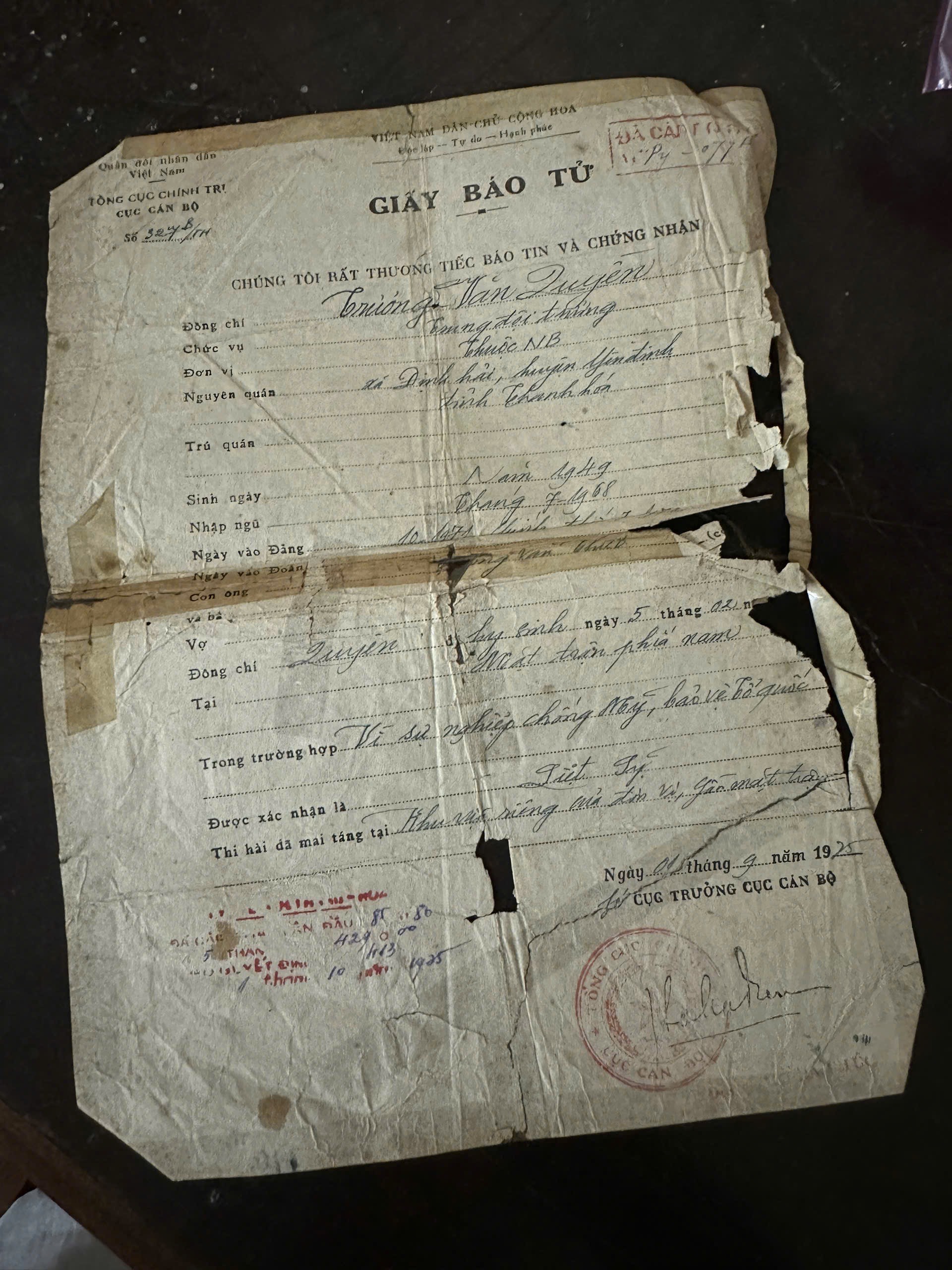 - Nơi an táng ban đầu: Giấy báo tử ghi mai táng tại khu vực riêng của đơn vị gần mặt trận