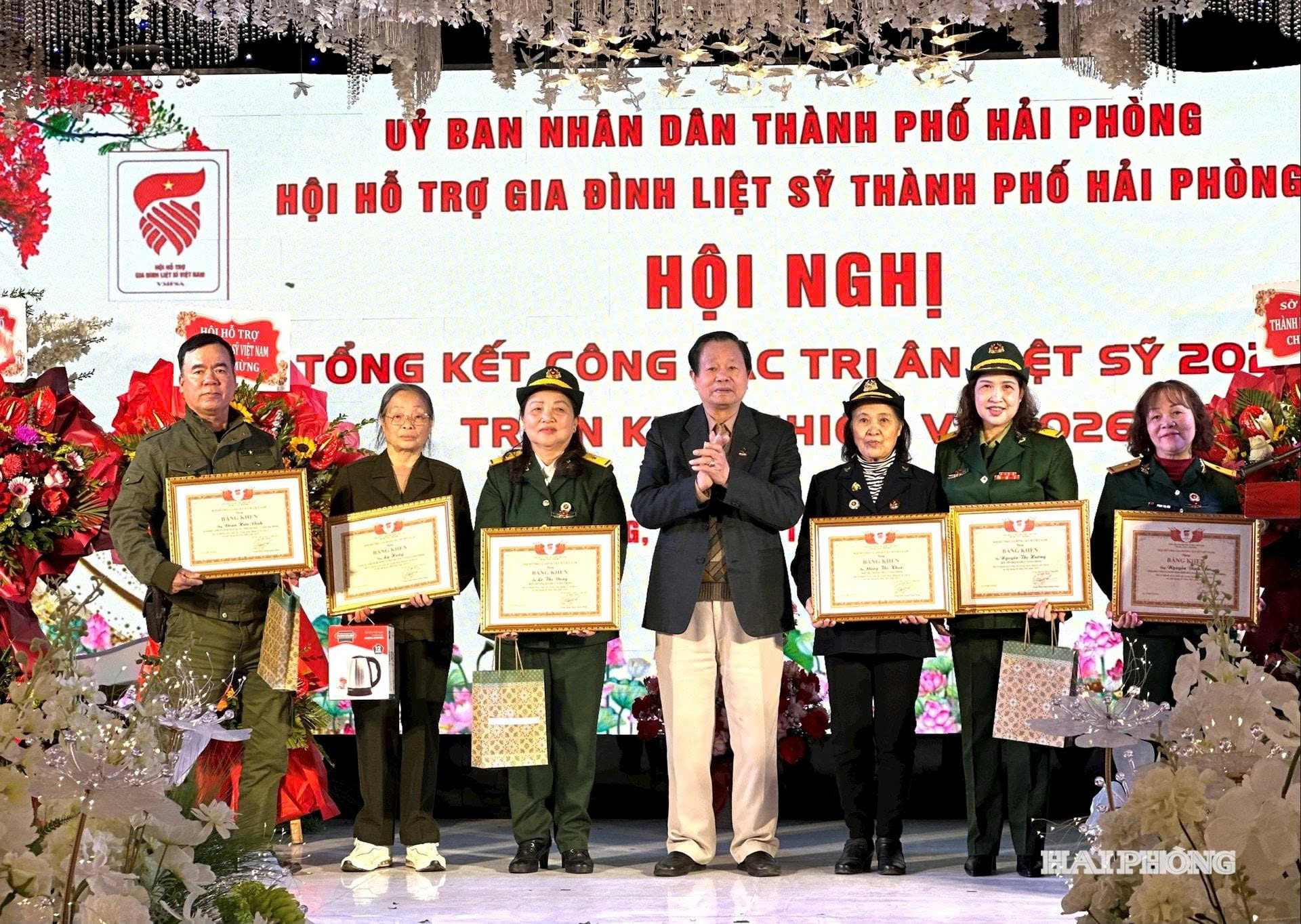 Phó chủ tịch Hội Hỗ trợ gia đình liệt sĩ Việt Nam Nguyễn Hữu Oanh trao bằng khen cho các tập thể, cá nhân Hội Hỗ trợ gia đình liệt sĩ thành phố Hải Phòng có thành thích xuất sắc.