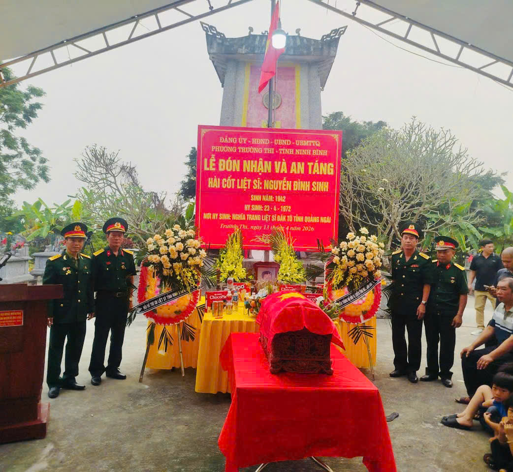 Ngày 13/4 Đảng ủy, chính quyền phường Trường Thi, tỉnh Ninh Bình long trọng tổ chức Lễ đón nhận, truy điệu và an táng hài cốt liệt sỹ Nguyễn Đình Sinh từ Nghĩa trang liệt sỹ Đăk Tô, tỉnh Quảng Ngãi về Nghĩa trang liệt sỹ Tân Thành, phường Trường Thi.