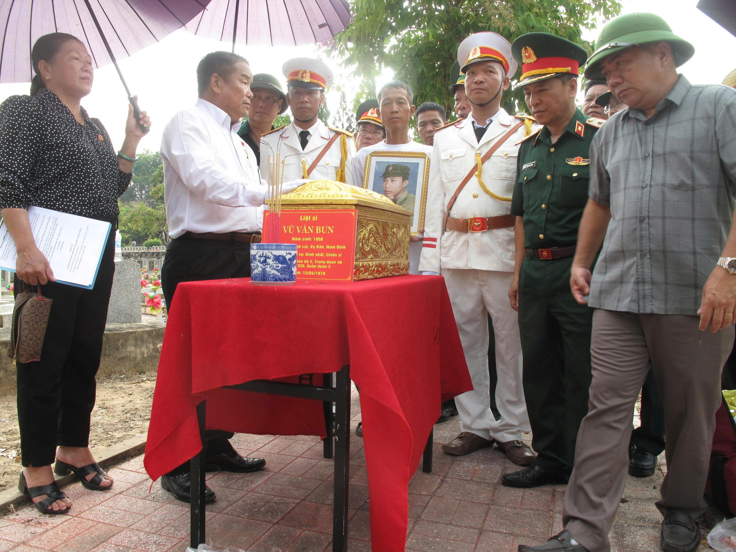 Theo nguyện vọng của gia đình, được sự đồng ý của chính quyền địa phương và Ban quản trang Nghĩa trang liệt sĩ Đồi 82 (Tây Ninh), sáng ngày 24/4 /2026, Văn phòng Cơ quan đại diện phía Nam Hội Hỗ trợ gia đình liệt sĩ Việt Nam phối hợp với Hội Hỗ trợ gia đình liệt sĩ tỉnh Tây Ninh và Ban quản trang Nghĩa trang liệt sĩ Đồi 82 cùng gia đình đã tổ chức làm lễ cất bốc và di dờ đưa liệt sĩ Vũ Văn Ban về quê hương.
